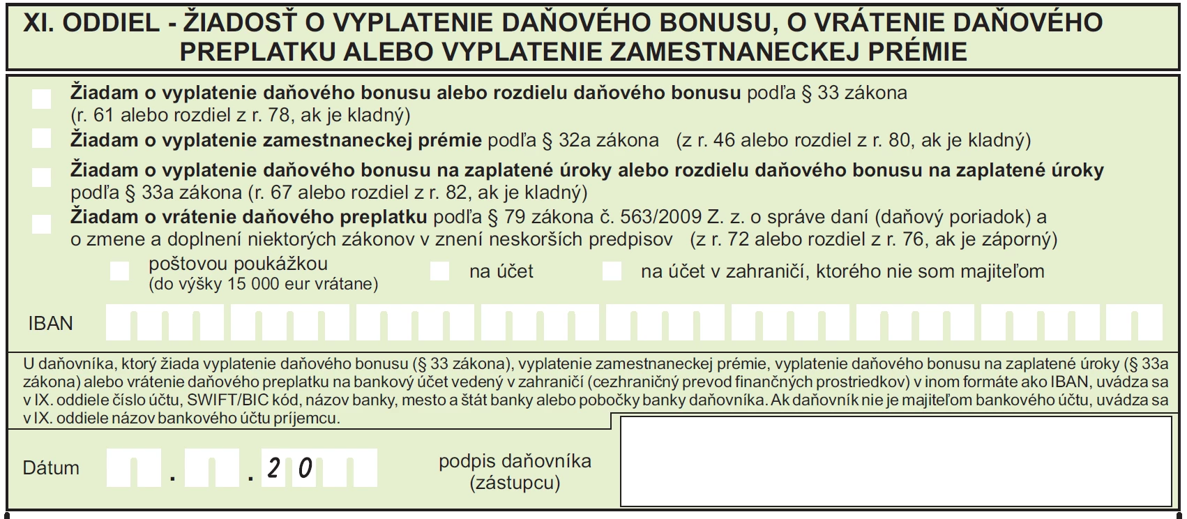 Podmienkou vyplatenia daňového preplatku, resp. daňového bonusu je správne vyplnený a podpísaný XI. ODDIEL daňového priznania, ktorý je zároveň žiadosťou o jeho vyplatenie.